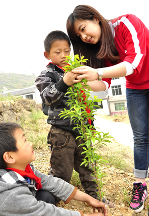 志愿者传授孩子们养育树苗的知识