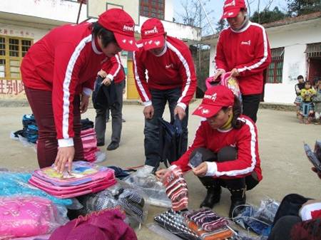 14日一大早,11名安利志愿者从南宁出发,历时7个小时的路程,进入南丹县后一路沿着蜿蜒陡峭的碎石路到达里湖瑶族乡化果小学,此时,化果小学的47名学生已经站在教室门口,他们穿着单薄的上衣,有的孩子只穿着短裙,光着小腿,脚上穿的是凉鞋或水鞋,小脸和小手冻得发紫开裂。