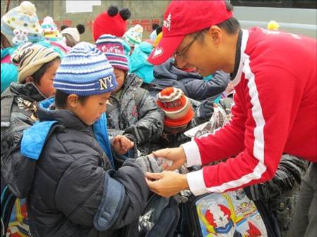 看着这一幕,志愿者们二话不说,一下车就迫不及待的把带来崭新的棉衣给孩子们穿上,并将提前准备好装有帽子、手套、围巾的"安利阳光书包"送到孩子们手里。