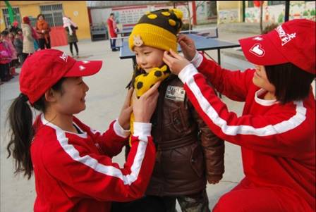 志愿者为孩子们戴上棉帽